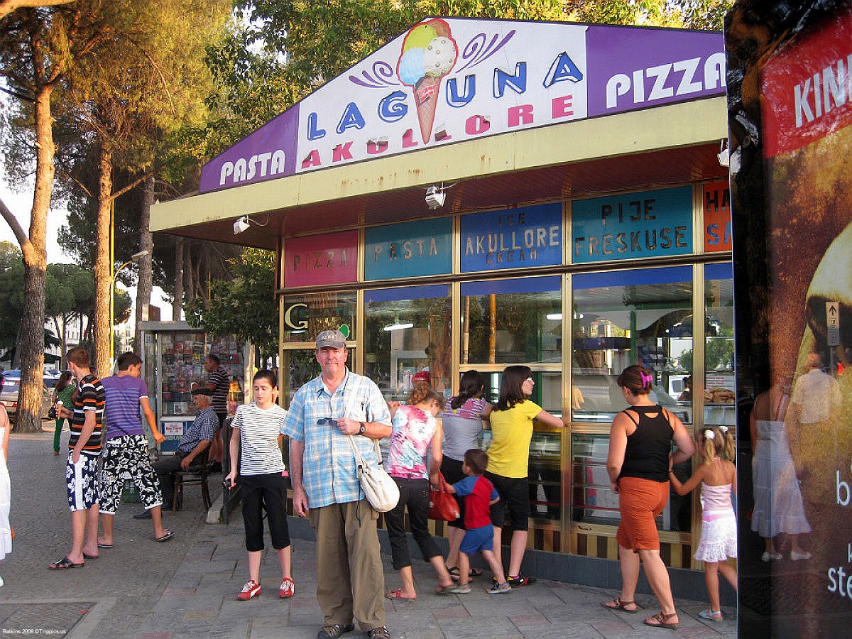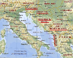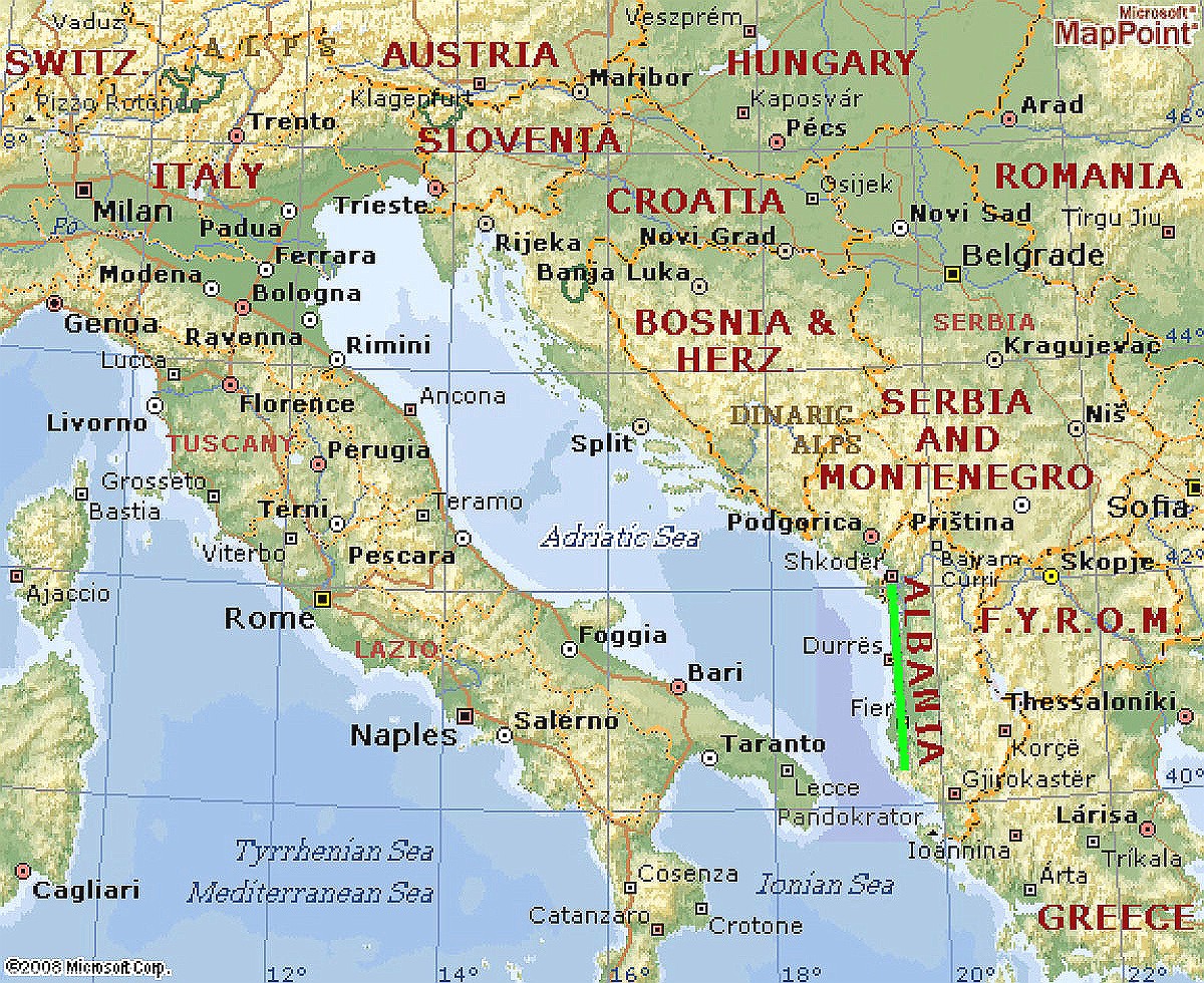 6 First stop Albania. Albania, officially the Republic of Albania is a country in South Eastern Europe. It is bordered by Greece to the south-east, Montenegro to the north, partially-recognized Kosovo to the northeast, and the Republic of Macedonia to the east. It has a coast on the Adriatic Sea to the west, and on the Ionian Sea to the southwest. It is less than 72 km (45 miles) from Italy, across the Strait of Otranto which links the Adriatic Sea to the Ionian Sea.
