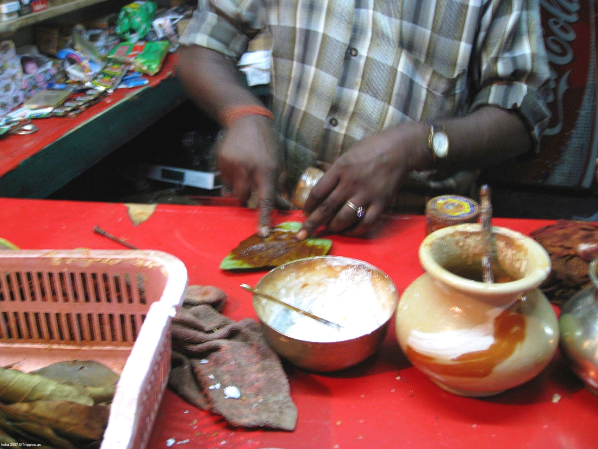 7 Please wait, movie loading. After watching the merchant sell paan (betel nut) for awhile I decide to order a "sweet pan".