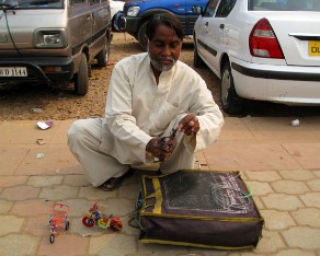 18 This man is making small bicycles and pedicycles from twisted wire. He uses needle nosed pliers and others instruments in a pain staking process to produce these works. I purchased the pedicycle you see in the picture and a bicycle he made.