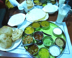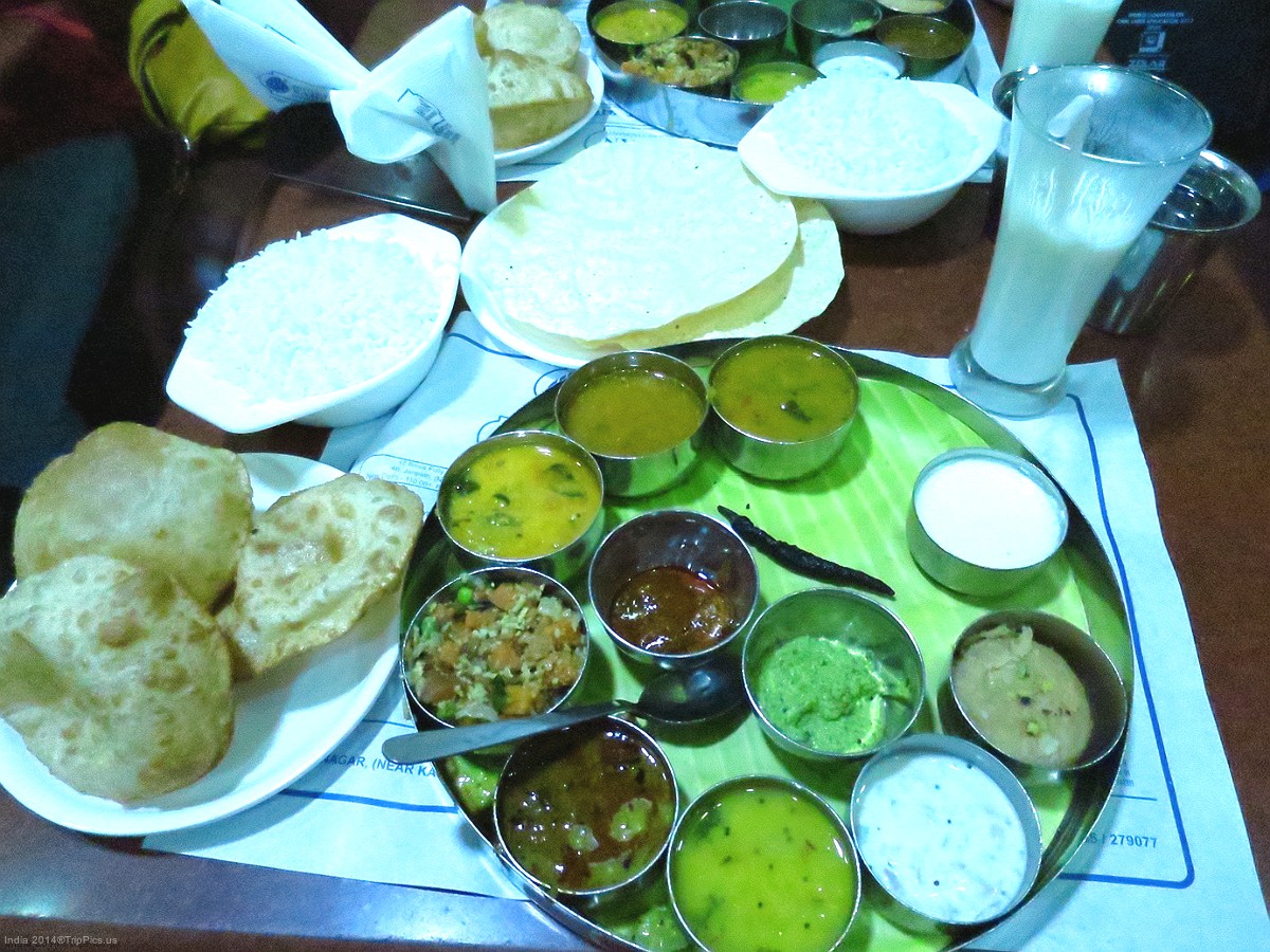 18 After a day of touring Delhi we order a typical Indian dinner called a thali and a sweet lassi to drink. A little bit of everything.