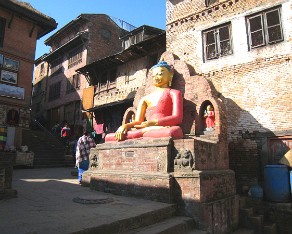 7 First sight at the top is a great Buddha. The Bodhisatva Manjushri had a vision of the lotus at Swayambhu and traveled there to worship it. Seeing that the valley can be good settlement and to make the site more accessible to human pilgrims, Manjushri cut a gorge at Chovar. The water drained out of the lake, leaving the valley in which Kathmandu now lies.