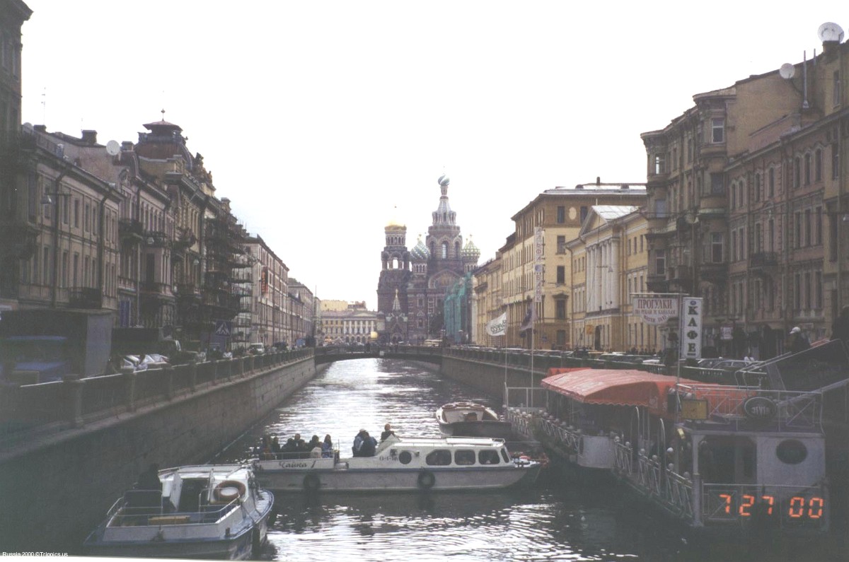 Looking down a canal at The Church of The Savior from the main street of Nevskiy Prospect.