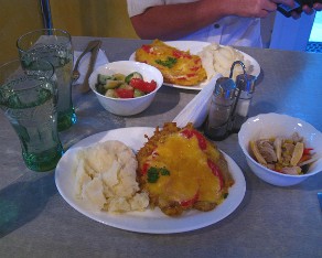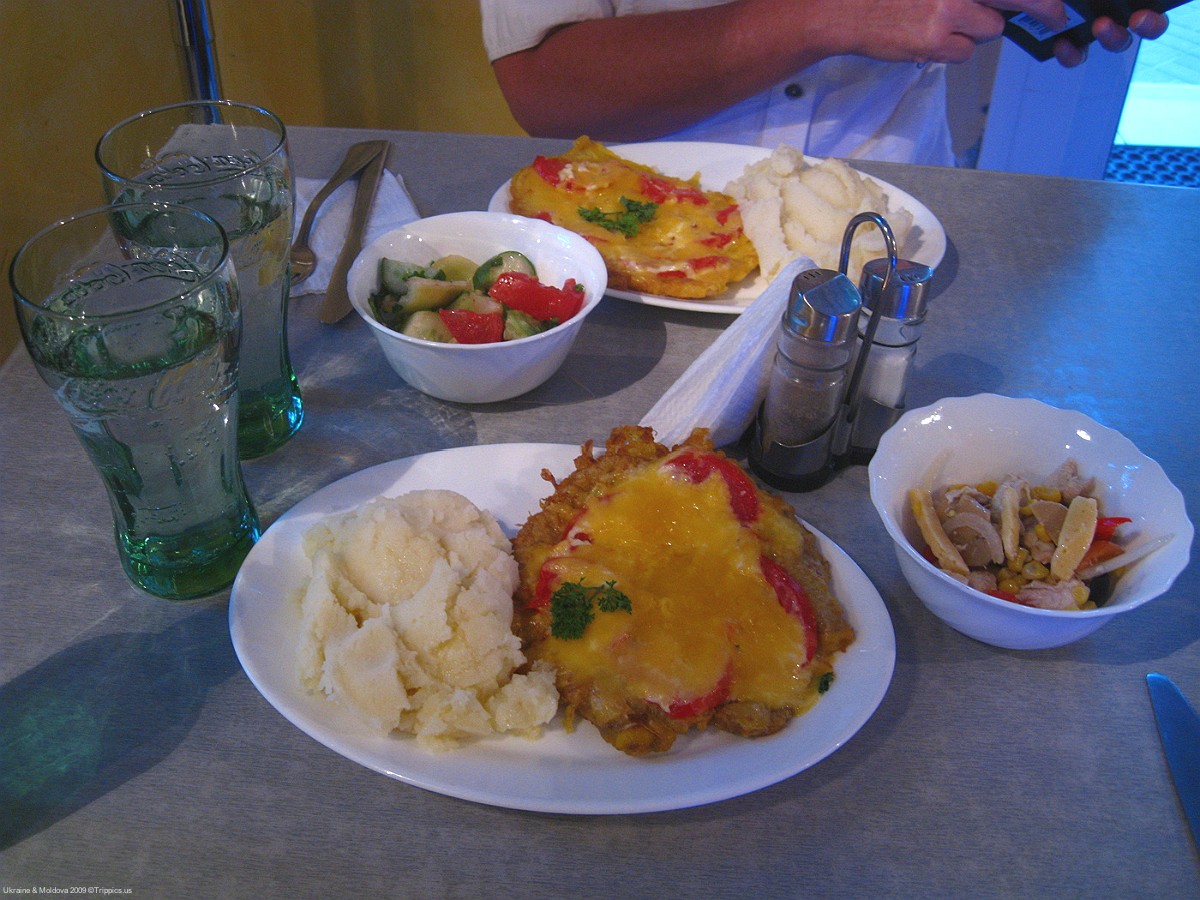 10 Dinner is served. We find the Bictpo restaurant and have a satisfying dinner of cheese covered pork cutlets, mashed potatos and small salad on the side. It all costs just a little over $8.00 for two.
