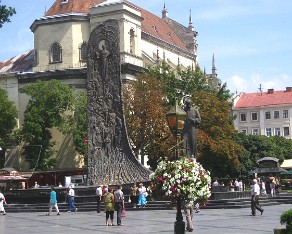 9 Wait, Quicktime movie loading. Skateboarders and others enjoy the space in front of the University to practice their moves, and others just enjoy the walk through the park. The statue is of Ivan Franko, poet, linguist and reformer of the Ukrainian language, for whom the university is named.