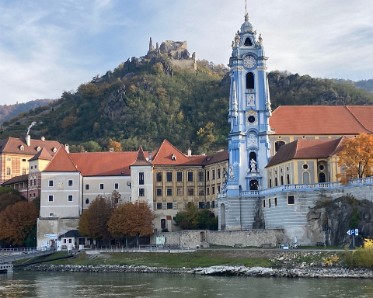 16 We set sail along the Danube and pass the Durnstein Castle ruins.